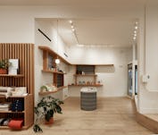 Located in Hayes Valley, south of McAllister Street—an area spared by the fires following the 1906 San Francisco earthquake—this space reflects the neighborhood's preserved architectural character amid city-wide gentrification. Formerly home to Yoga Tree and Flight 001, Brooklinen now occupies the space with a fresh storefront, interior surfaces, and a modern attitude. Custom fixtures of natural wood, ceramic tile, neutral stone, and simple lighting complement the aspirational spirit of the brand and the evolving neighborhood.