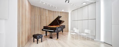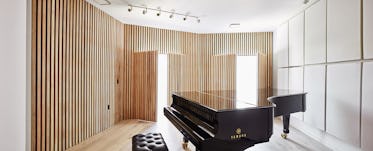 This unique installation of an acoustically isolated room provides a respite from bustling Noe Valley for the recitation and recording of music. The oak and felt wall covering and birch floors convey a natural wooded calm while the ambient lighting coves and direct lighting help to focus on the rhythmic present.
